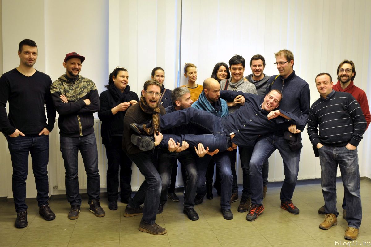 Elöl Móricz Sabján Simon, a Népszabadság, Koszticsák Szilárd, az MTI/MTVA fotóriportere, Urbán Ádám szabadúszó fotós, Hirling Bálint, a vs.hu, Fazekas István, HVG fotóriportere (kézben tartják), Stiller Ákos, a hvg.hu, Illyés Tibor, az MTI/MTVA fotóriportere és Bácsi Róbert László szabadúszó fotós (b-j), hátul Kurucz Árpád, a Magyar Idõk, Balogh Zoltán, az MTI/MTVA, Bruzák Noémi, az MTI/MTVA, Bodnár Boglárka, az MTI/MTVA, Ajpek Orsolya, az index fotóriportere, Pályi Zsófia szabadúszó fotós és Bödey János, az index.hu fotóriportere (b-j) a 34. Magyar Sajtófotó Pályázat eredményeit ismertetõ sajtótájékoztatón a Magyar Újságírók Országos Szövetsége (MÚOSZ) budapesti székházában 2016. január 25-én. Kilenc díjat nyertek a közmédia fotóriporterei.