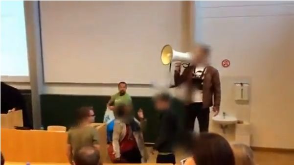Az egyetemi órát az Identitäre nevű szélsőjobboldali szervezet nagyjából tíz aktivistája szakította félbe. A fiatalok kamerával és hangosbemondóval érkeztek, néhányuk beöltözött, volt, aki burkát viselt. Egy megkövezési jelenetet imitáltak, és transzparensükön tiltakoztak a bevándorlás ellen. (Az akcióról készült videót itt tudja megnézni.)