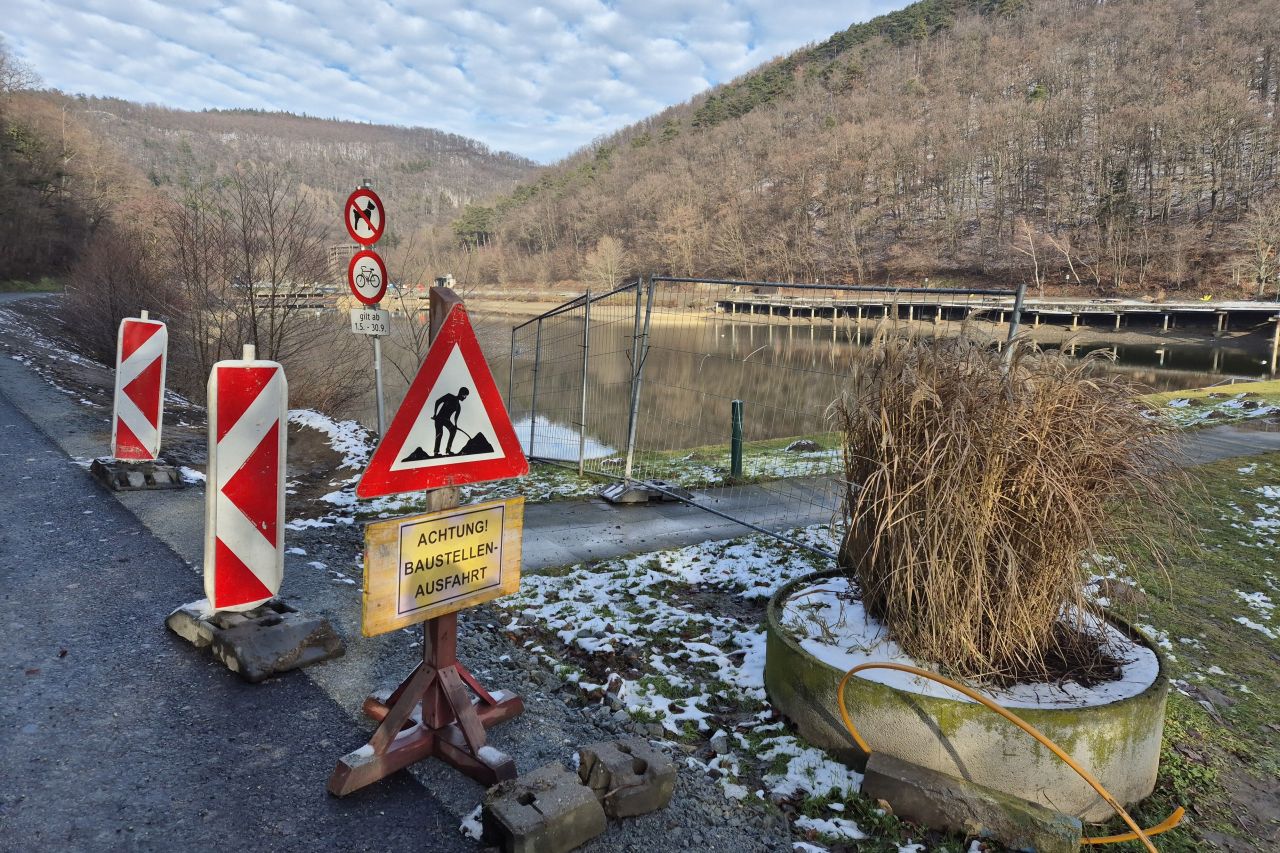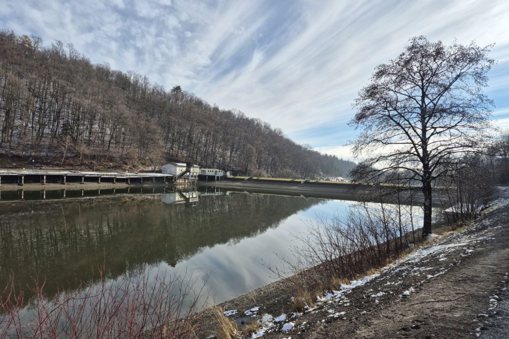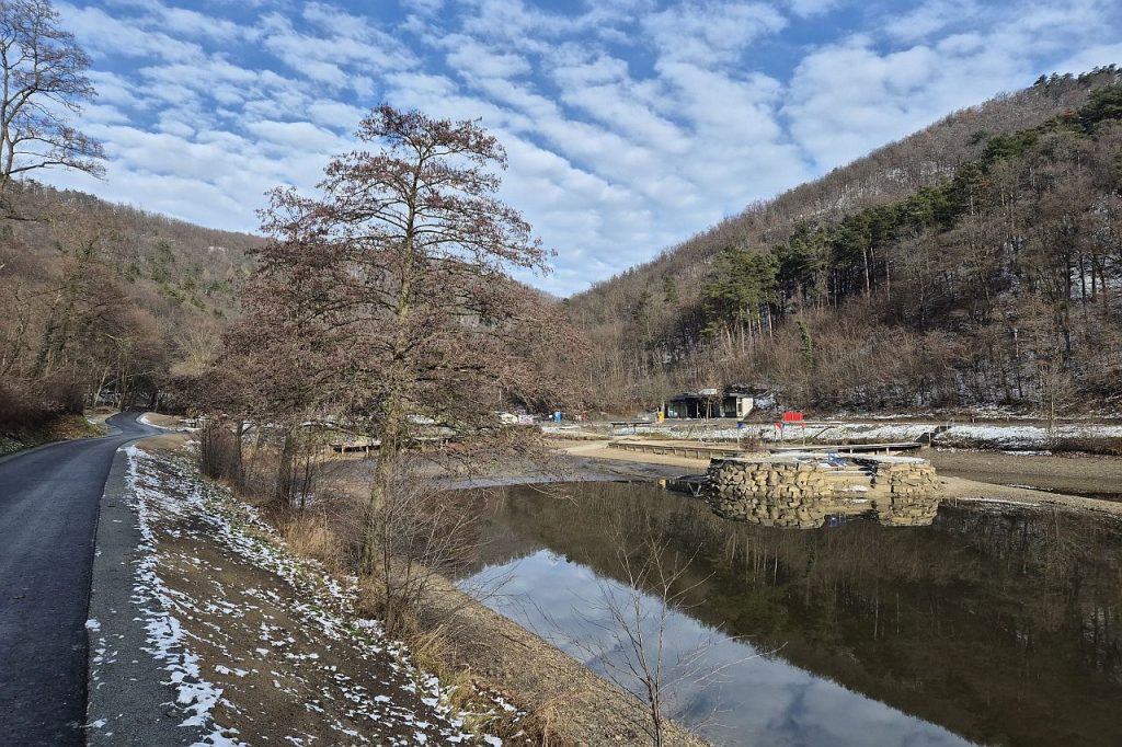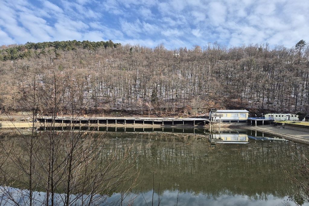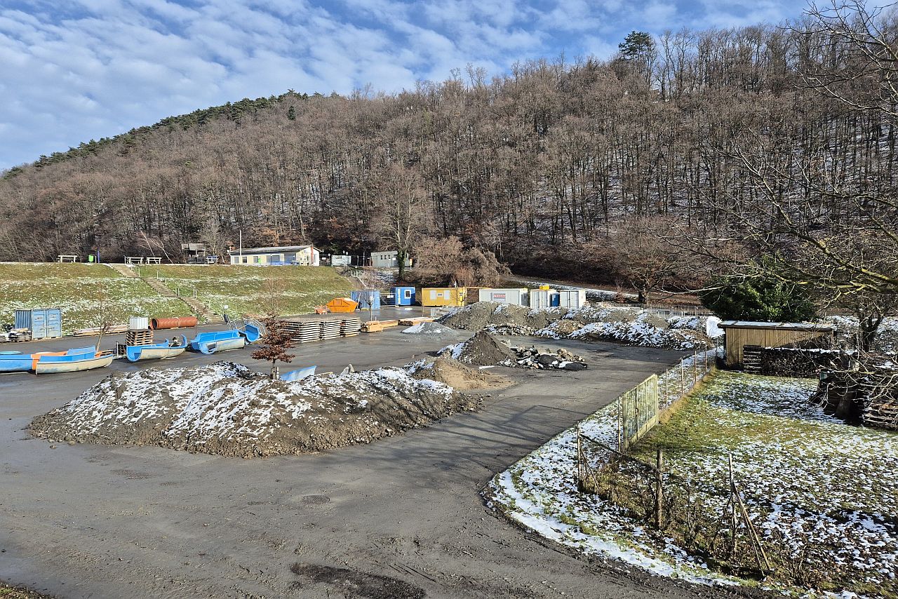 A tó vize is alaposan le van engedve, a gát alatti tér lekerített munkaterület: le van zárva, munkagépek és építési anyagok várják itt sorsukat.