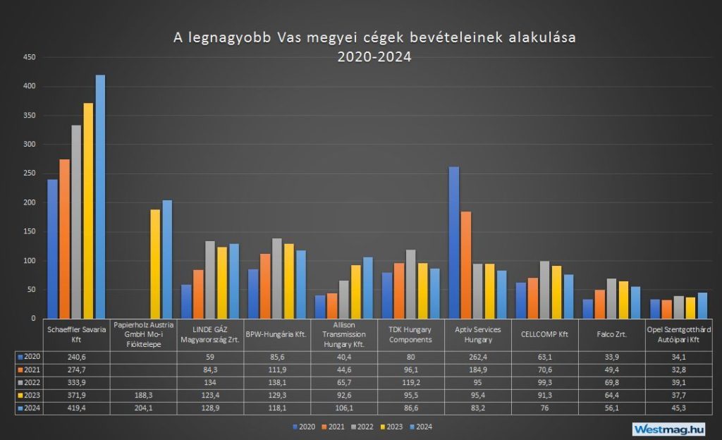 A 2024-es lezárt pénzügyi év alapján Vas megye legnagyobb vállalata továbbra is a Schaeffler Savaria Kft., amely nemcsak vezető pozícióját őrizte meg, hanem tovább is tudta növelni éves árbevételét 372 milliárdról 419,5 milliárd forintra.